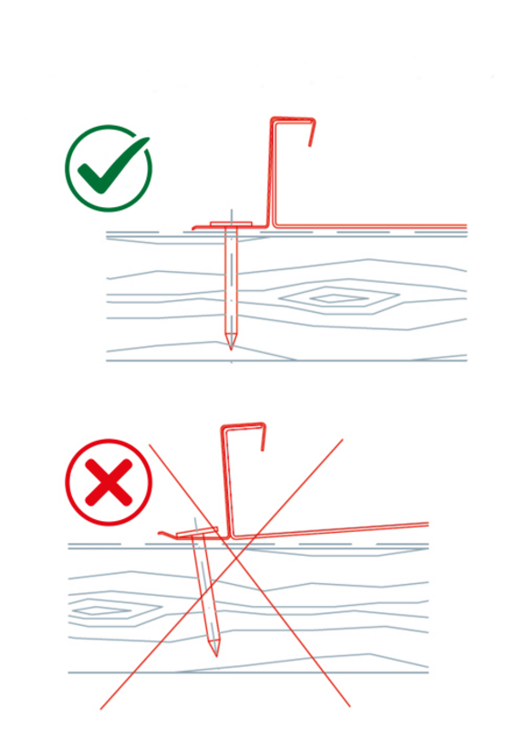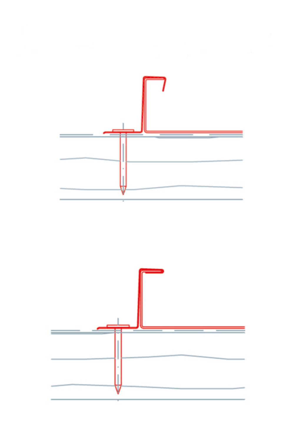 Pred pripevnením krytinových pásov na spodnej prekrývanej strane na debnenie pomocou nerezových príponiek treba najprv úplne uzavrieť drážku na zavesenej prekrývajúcej hornej strane.