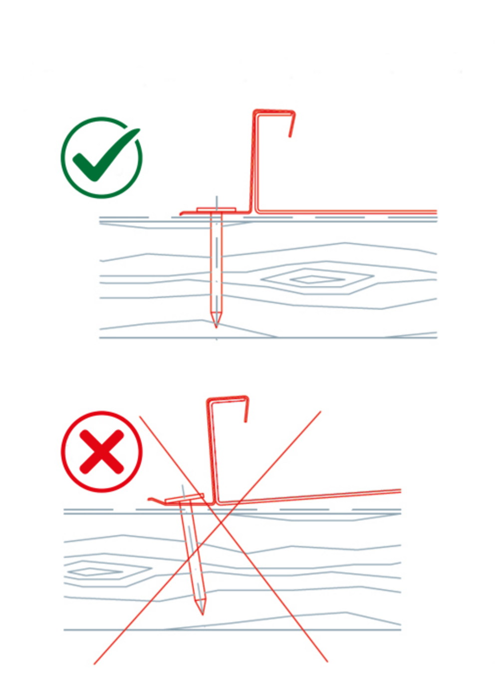 Pri pripevňovaní nerezových pevných a posuvných uhlových príponiek PREFA dbajte na to, aby boli ryhované klince na upevnenie dostatočne zapustené a aby nevyčnievali nad výšku prelisu, aby sa zamedzilo otlačeniu a odretiu na uloženom zastrešení. Na upevnenie PREFA pevných uhlových príponiek sa vyžaduje použiť 2 ks PREFA nerezových ryhovaných klincov. Na upevnenie posuvných uhlových príponiek PREFA treba na príponku vždy použiť 3 ks. PREFA nerezových ryhovaných klincov.