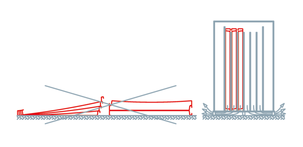 Otvorené balenia alebo plechové diely zabezpečte pri silnejšom vetre proti pádu. Kartónové obaly uložené na streche chráňte pred dažďom plachtou . Materiál treba skladovať na rovnom povrchu v stojatej polohe . Skladovaný materiál by mal byť chránený a skladovaný na suchom mieste.