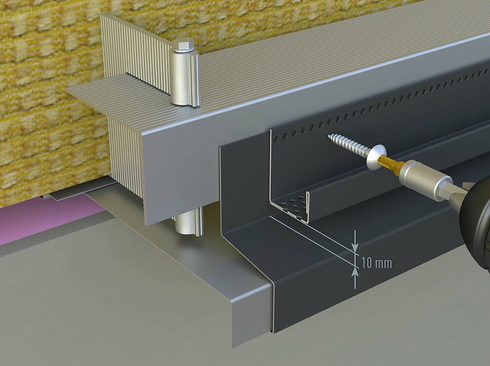 Pri pevnom bode sa závrtná skrutka skrutkuje priamo cez štartovací profil príp. perforovanú kryciu lištu. Aby sa zachoval posuvný bod, vyrazte požadovaný otvor pomocou klieští na vysekávanie pozdĺžnych otvorov.