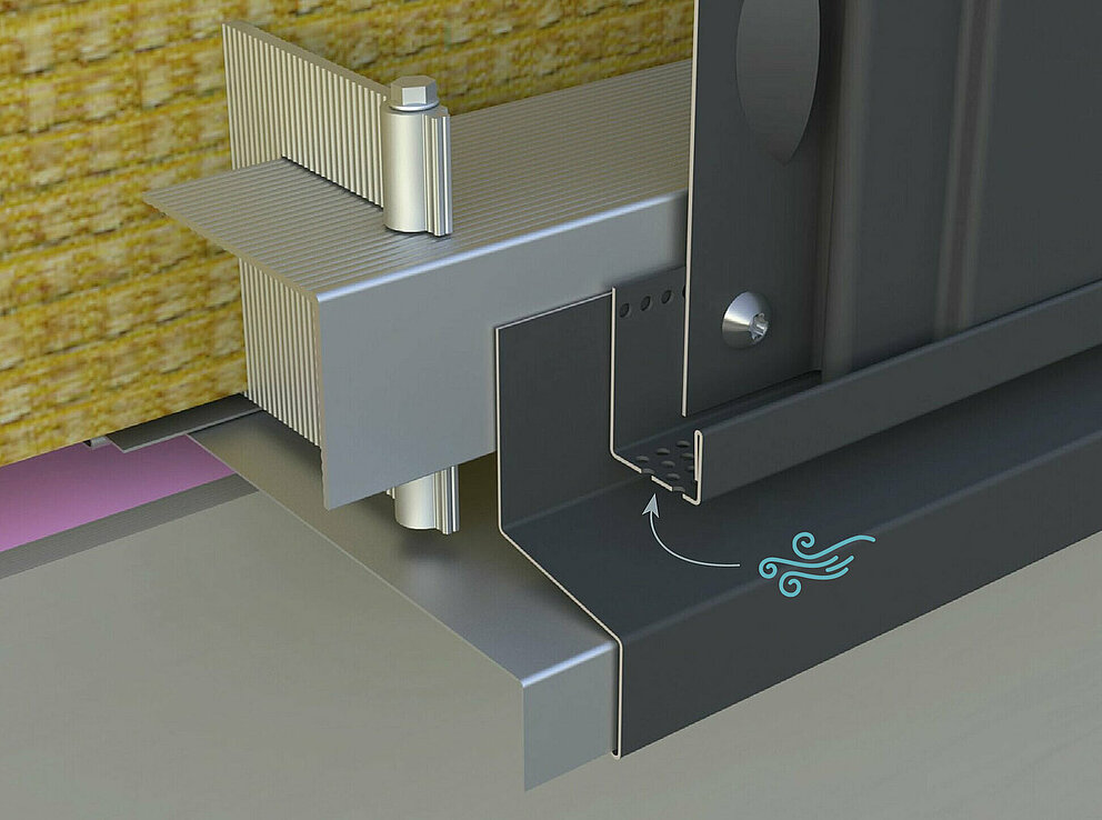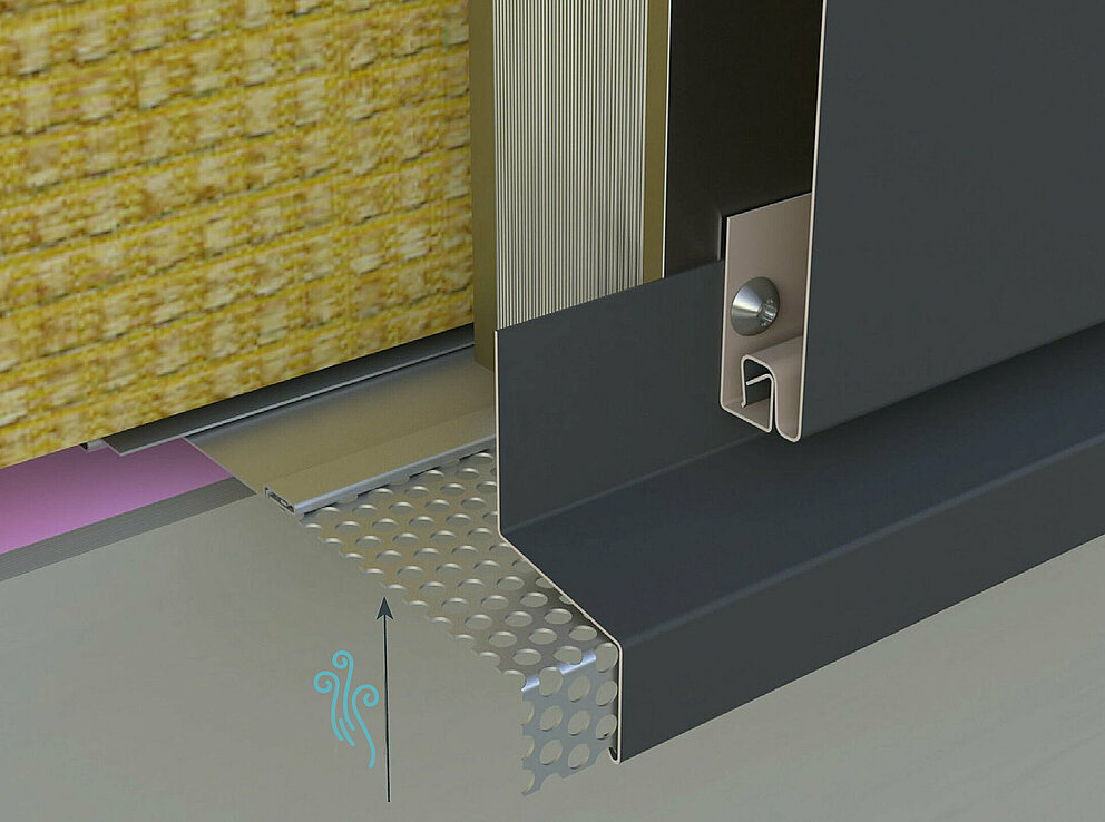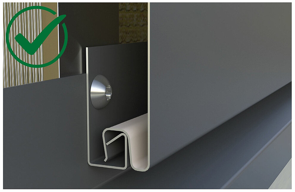Pri použití perforovanej krycej lišty a lamely Siding s koncovým ohybom musíte dbať na dodržanie vzdialenosť min. 5 mm medzi koncovým ohybom a perforovanou krycou lištou. Ak koncový ohyb dosadá priamo na perforovanú kryciu lištu, nie je zabezpečený dostatočný prierez na prívod vzduchu a funkčná prevetrávaná medzera.