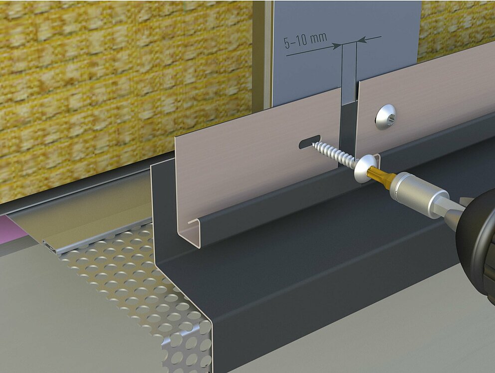Pri dlhších rozmeroch budov sa štartovacie profily a perforovaná krycia lišta nesmú kvôli dilatácii materiálu dotýkať. Dodržte dilatačnú vzdialenosť 5 – 10 mm (v závislosti od dĺžky štartovacieho profilu).