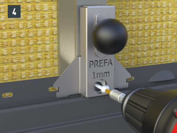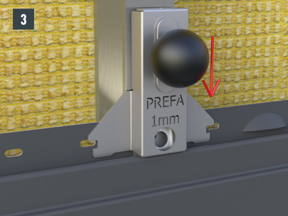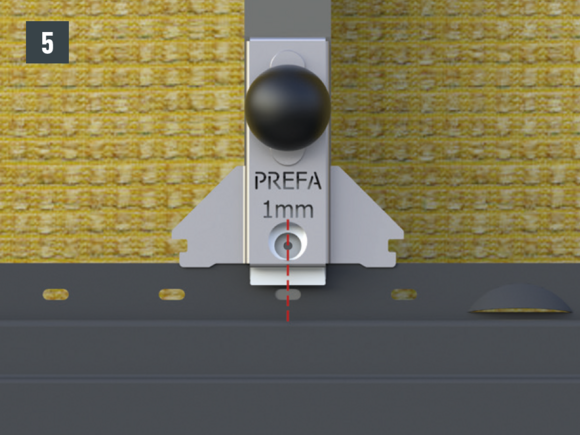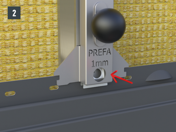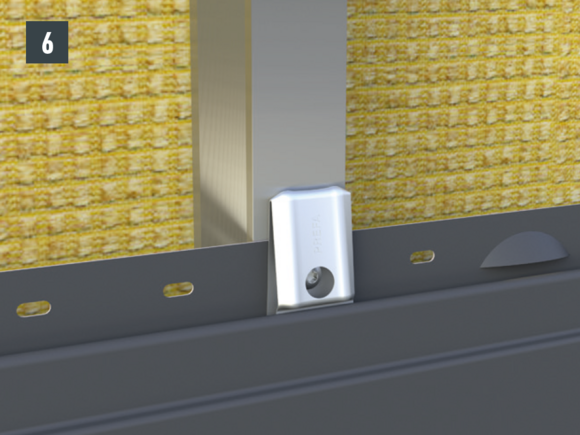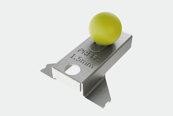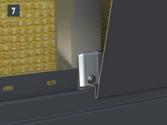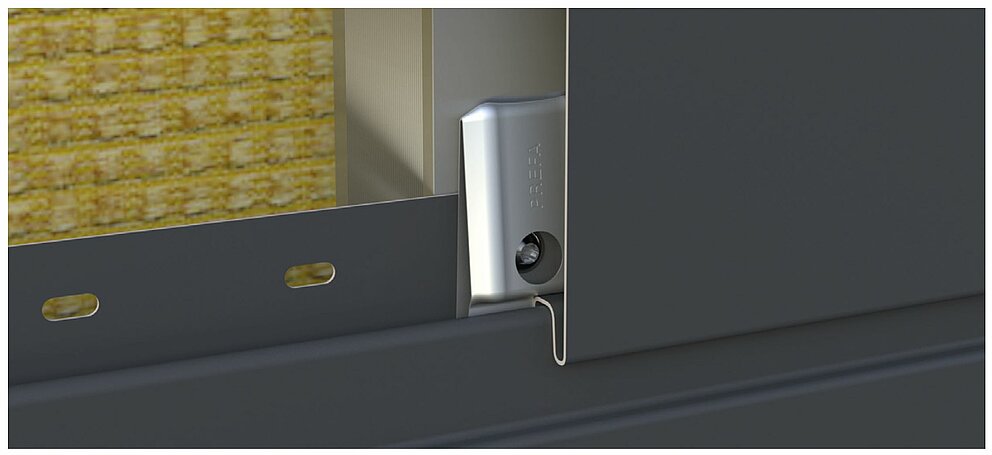 Vzdialenosť medzi poistným veterným klipom a perom lamely Siding je rozhodujúca pre montáž bez deformácie so zohľadnením dilatácie materiálu. Z tohto dôvodu montujte poistný veterný klip výlučne pomocou vhodnej montážnej pomôcky, aby bola zaručená rovnomerná vzdialenosť.