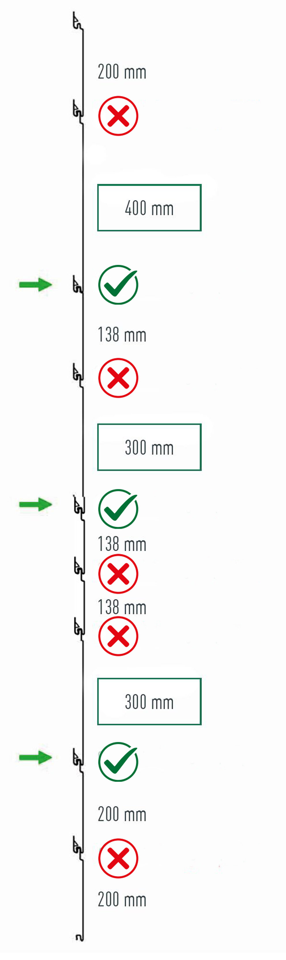 Poistný veterný klip sa musí montovať pri tejto kombinácii hrúbky materiálu a konštrukčnej šírky (každý Siding musí byť upevnený min. na dvoch profiloch podkonštrukcie).
