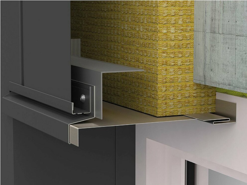 Odkvapový profil sa montuje spolu s perforovanou krycou lištou na podkonštrukciu. Dbajte na to, aby medzi odkvapovým profilom a perforovanou krycou lištou ostal odstup 10 mm pre optimálny prívod vzduchuz. Aby sa dosiahla presná paralela, odporúčame použiť šablónu.