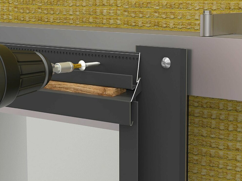 Potom sa vľavo a vpravo od okna na podkonštrukciu naskrutkujú pridržiavacie uholníky pre plech ostenia. Súčasne sa na okenný rám alebo múr pripevnia aj násuvné lišty pre plech ostenia a násuvná lišta pre okenný preklad.