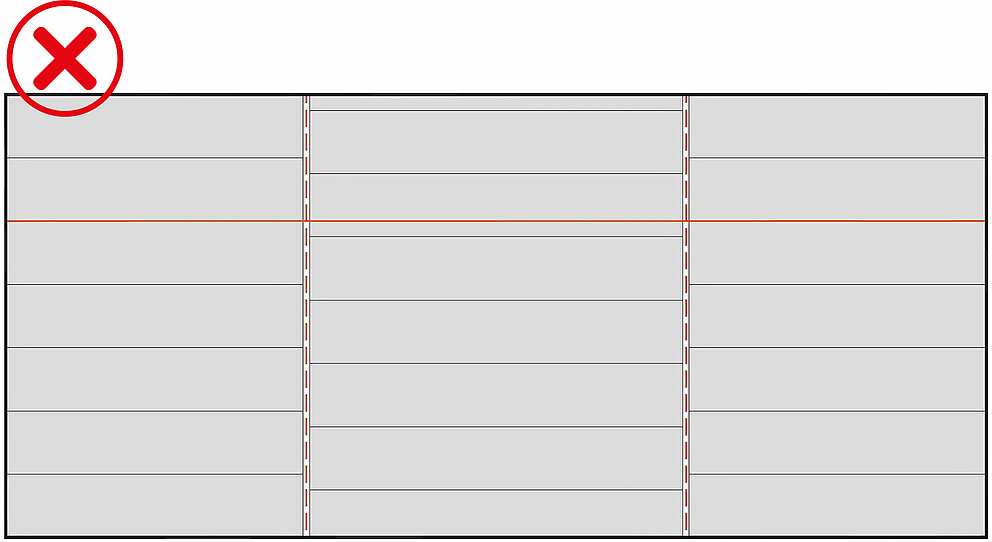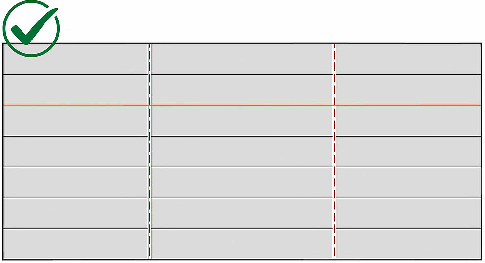 Obzvlášť dbajte na to, aby po prerušeniach, napríklad pri spojovacích špárach, ostala zachovaná línia a os. Na tento účel sa odporúča v pravidelných intervaloch vykonávať šnúrovanie lamiel Siding, Siding.X a Siding perforovaný pomocou kontrolných línií.