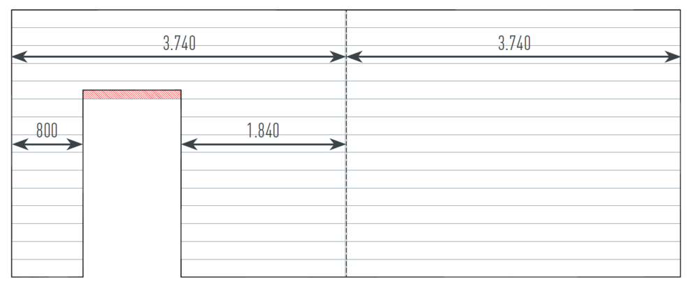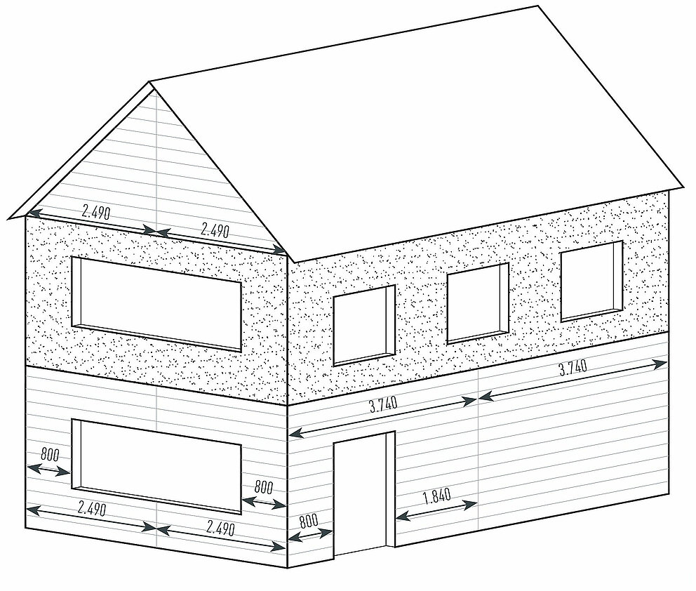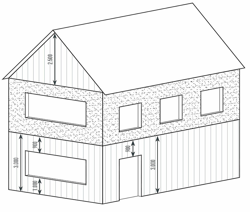 Výrezy, ako napr. okná alebo dvere, ktoré čiastočne zasahujú do lamiel Siding, sa pri určovaní množstva materiálu nezohľadňujú a prispôsobujú sa priamo na stavbe (plocha označená červenou).