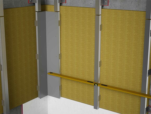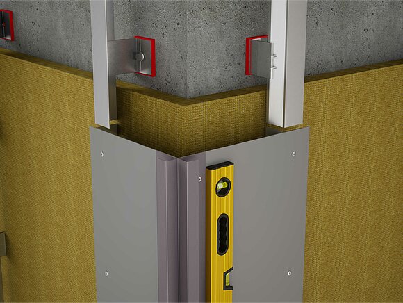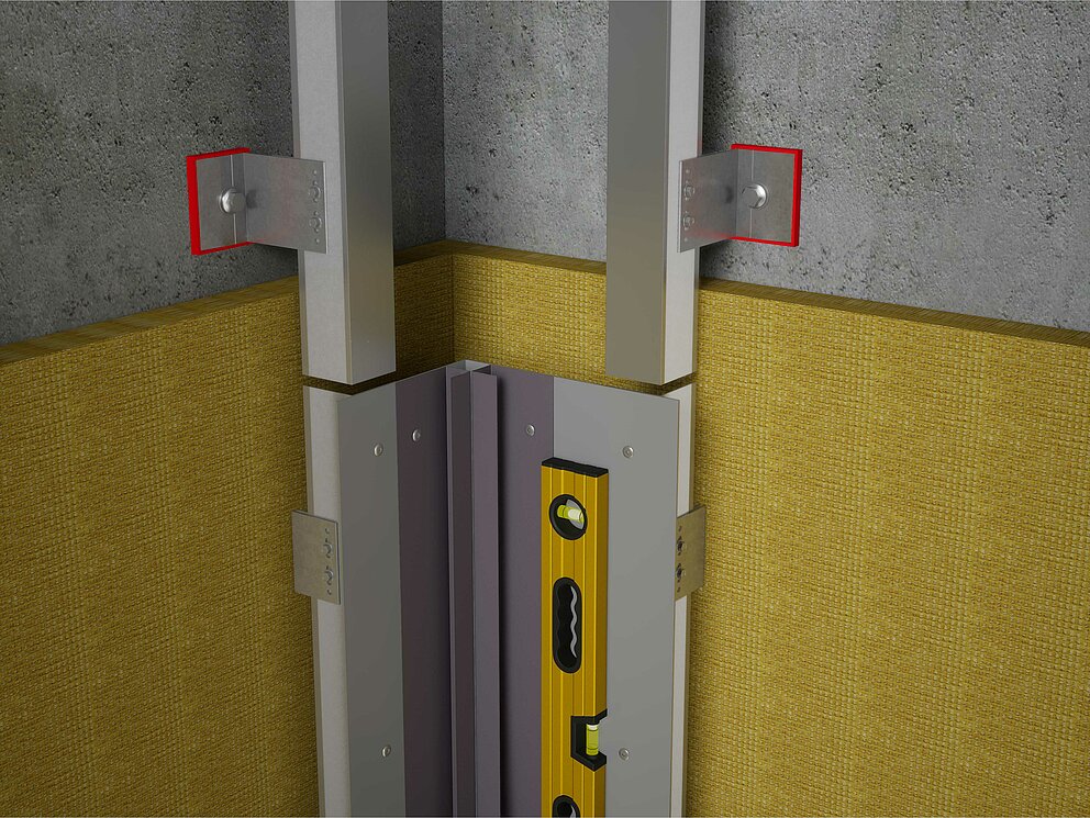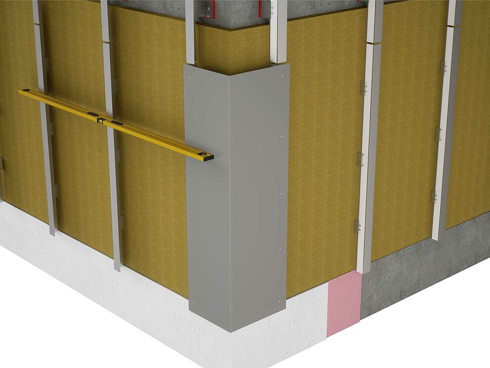 Pripravte na montáž vnútorného a vonkajšieho rohového profilu podkonštrukciu na horizontálnu montáž profilov. Na montáž vnútorných alebo vonkajších rohových profilov musíte najprv vertikálnu podkonštrukciu spojiť s nosným uholníkom z hliníkového tabuľového plechu s hrúbkou 2 mm alebo pozinkovaného oceľového plechu (1 mm). Už pri montáži podkonštrukcie dbajte na to, aby ste nosné profily umiestnili o hrúbku materiálu nosného uholníka viac dovnútra, aby sa zabezpečila rovinnosť podkonštrukcie.