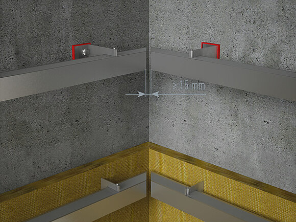 Pri montáži vnútorných alebo vonkajších rohových profilov dbajte na to, aby nosné profily podkonštrukcie neboli stykované v oblasti rohu. Zachovajte vzdialenosť min. 15 mm. Pri upevňovaní musíte zohľadniť montáž umožňujúcu dilatáciu s jasnou definíciou pevných a klzných bodov.