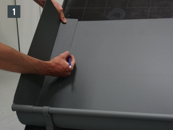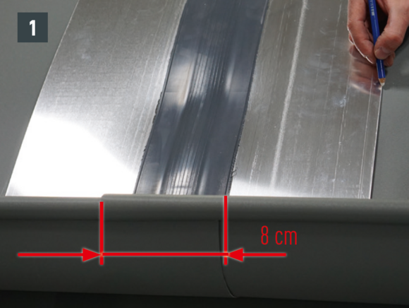 Falce preložte tak ďaleko, aby nástrešný žľab ležal min. na 15 cm na nástrešnom oplechovaní. Zohľadnite spád.