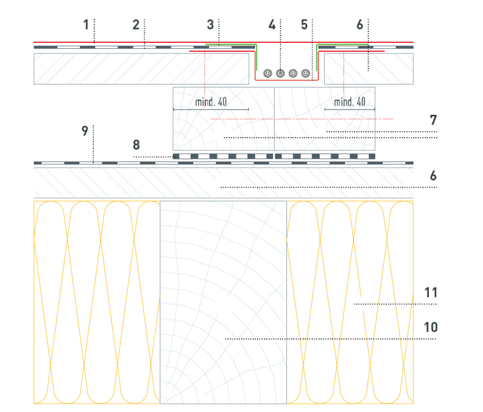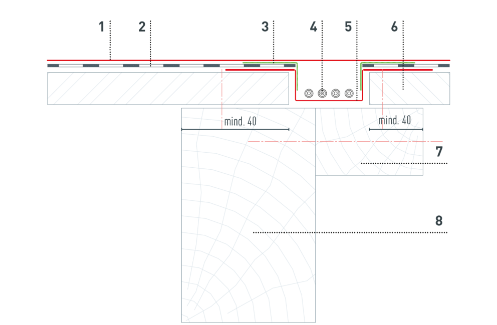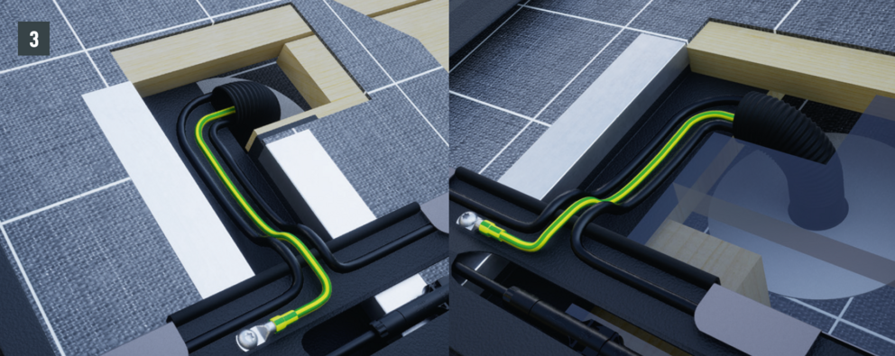 Z dôvodu potrebného vedenia kábla je potrebné drevenú podkonštrukciu vyhotoviť podľa nasledujúceho detailu. Počet a polohu káblových kanálov definuje technické oddelenie PREFA a zobrazí sa v montážnom pláne FV.