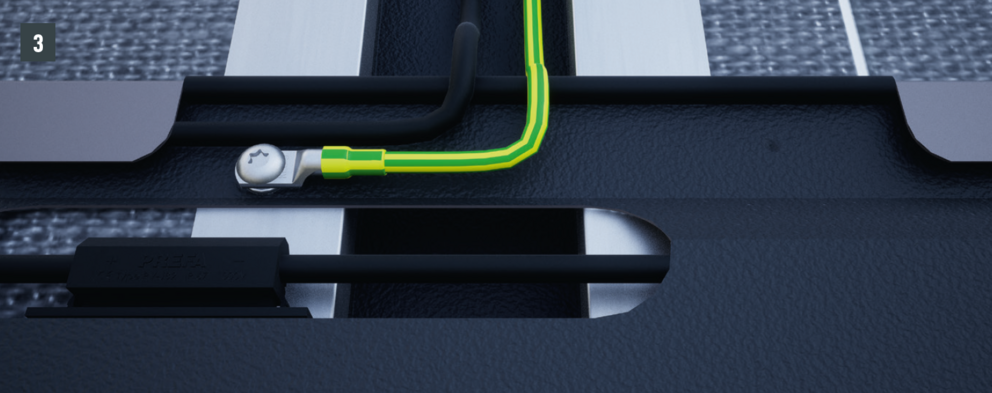 V poslednom rade je vyrovnanie potenciálu priskrutkované spolu s integrovaným solárnym panelom, ktorý leží nad káblovým kanálom (pozri obr. 3), uložený v káblovom kanáli so strunovými káblami a vedený v interiéri strechy.