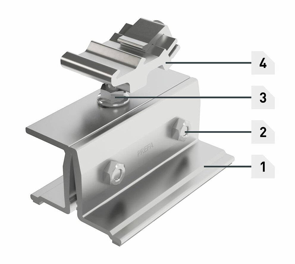 Bezproblémová montáž a spoľahlivé upevnenie na systémoch s dvojitou stojatou drážkou PREFALZ a FALZONAL®. Montáž solárneho držiaka PREVARIO PREFALZ neobmedzí dĺžkovú dilatáciu pásov. Je možná montáž na uhlové príponky, posuvné uhlové príponky a posuvné dlhé príponky. Pri montáži musíte zohľadniť zistenú vzdialenosť drážok, ako aj staticky zistený maximálny rozostup príponiek.