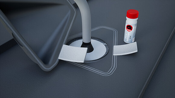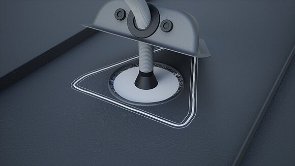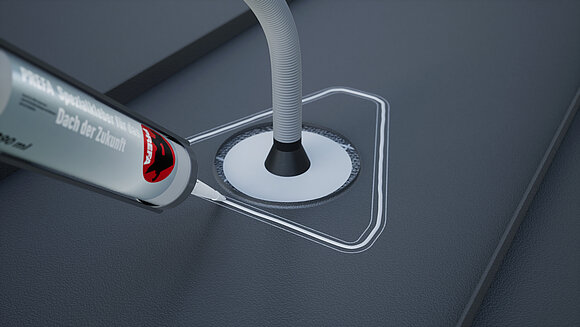 Naneste špeciálne lepidlo po obvode a prestrčte vlnitú hadicu cez priechodku. Následne nasaďte priestupový prvok solárnych vedení a natlačiť ho do stredu.