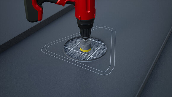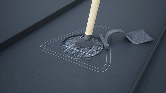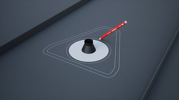 Umiestnenie priestupového prvku solárnych vedení a vyznačenie obrysu. Následne vyznačte oblasť lepenia (25 mm) a výrez rúrovej manžety. Vystrihnutie a zalemovanie kruhovej oblasti nahor.