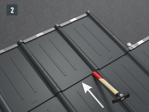 Škridlu zatlačte do horného falcu. Zľahka poklepte násadou kladiva na spodný okraj škridle (obr. 2).