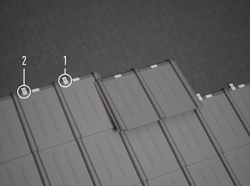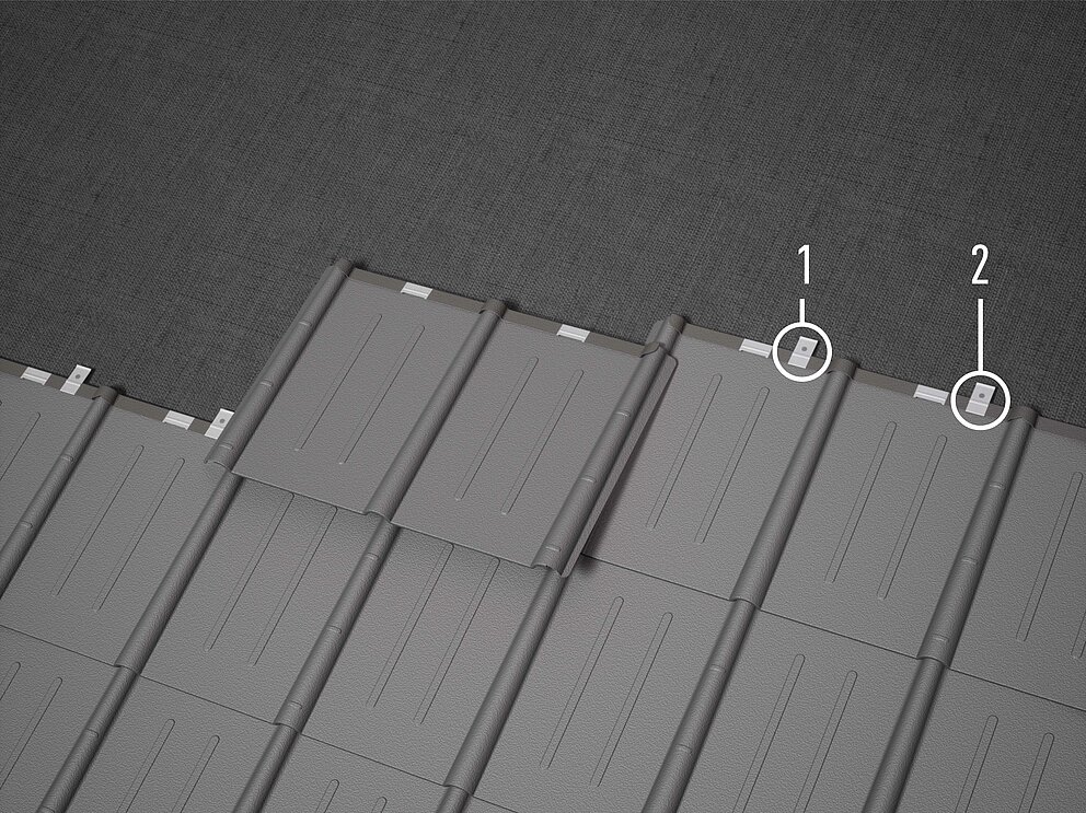 Každú škridlu upevnite dvoma patentovanými príponkami (štandardné upevnenie). Patentové príponky sa upevňujú vždy jedným ryhovaným klincom 2,8/30 alebo 2,8/25. Pri použití hrubších separačných vrstiev použite v prípade potreby dlhšie klince.