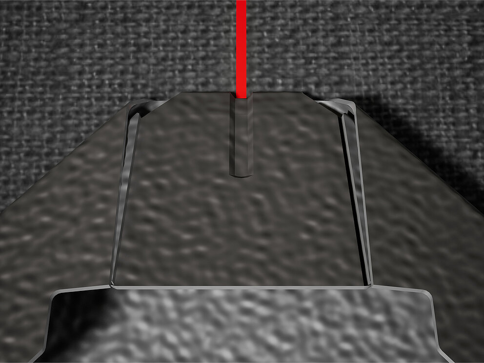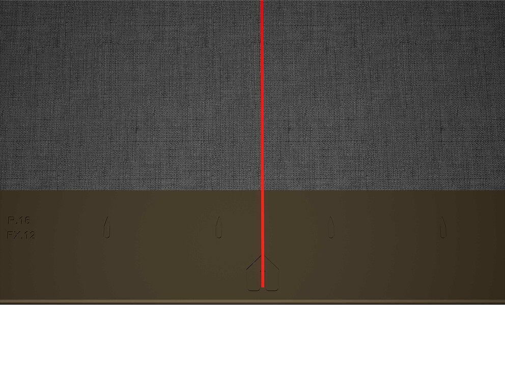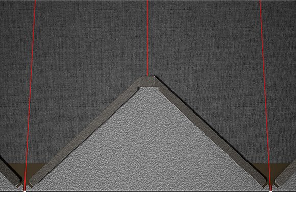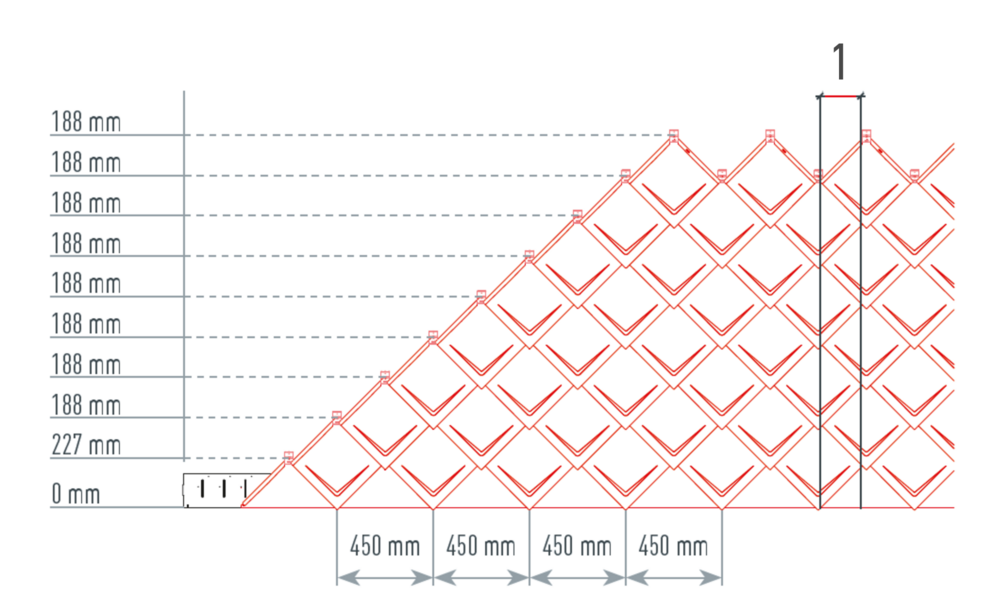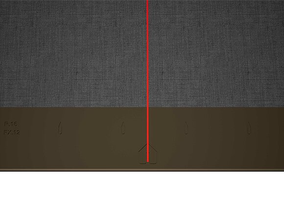 Na uľahčenie pokládky strešných šablón PREFA 29 × 29 sa odporúča vytvoriť mriežku zo zvislých šnurovaní v odstupoch 450 mm (ako pomôcka slúžia označenia v podkladovom páse). Aby bol rozmer šnúrovania v každom rade presný, možno v prípade potreby vyznačiť aj polovičný rozmer šnúrovania a kontrolovať ho v pravidelných intervaloch. Vyrovnajte štartovacie šablóny so zárezmi (na hornej hrane štartovacích šablón) na zvislé šnurovania v odstupoch (pozri obrázok nižšie). V súvislosti s tým je potrebné upozorniť, že oblasť určená pre bočné vyhnutie (napr. pre pripojenie záveternej lišty) sa nesmie nachádzať v strede šablóny 29×29 (rešpektujte symetriu/stred strechy).