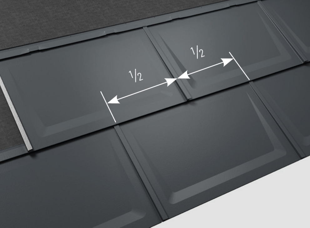 Na uľahčenie montáže s polovičným posunutím spojov je na hornom falci strešného panelu R.16 umiestnené označenie.
