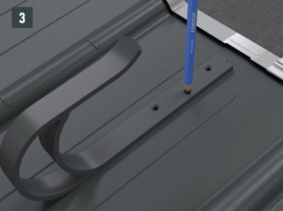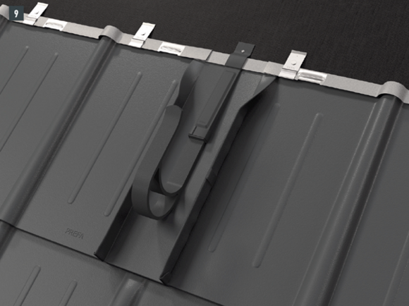 Neumiestňujte a neupevňujte podperu na falc alebo hrebeň vlny strešnej krytiny PREFA. Môže byť potrebné nainštalovať spevňovaciu podložku (napr. ak je v oblasti krokiev falc alebo hrebeň vlny).