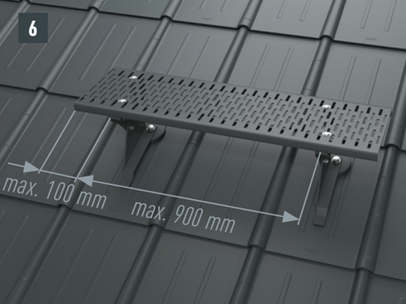 Základným predpokladom je strešný systém PREFA položený v súlade s platnými normami/odbornými smernicami na celoplošnom debnení s hrúbkou minimálne 24 mm a staticky nosná podkonštrukcia. Vzdialenosť krokiev nesmie presiahnuť 1 000 mm. Držiaky strešnej lávky sa majú namontovať na debnenie pomocou dodaných podstavcov. |