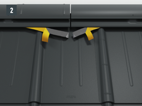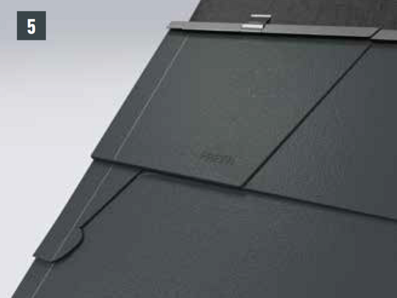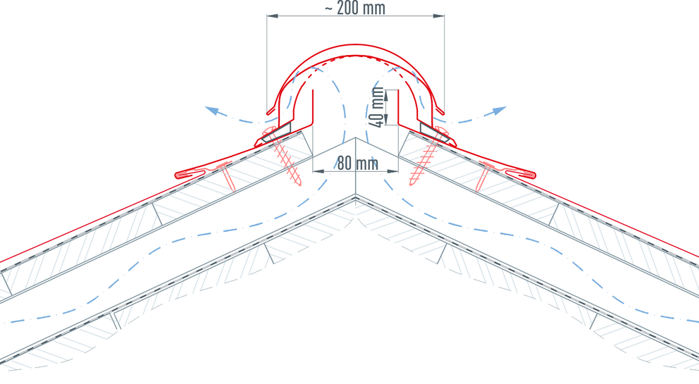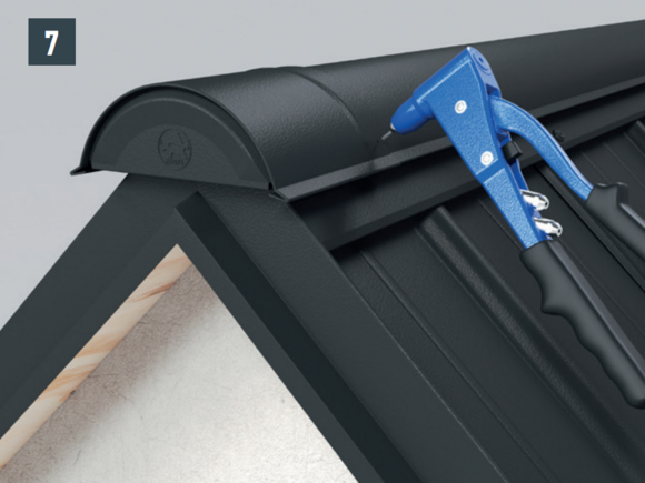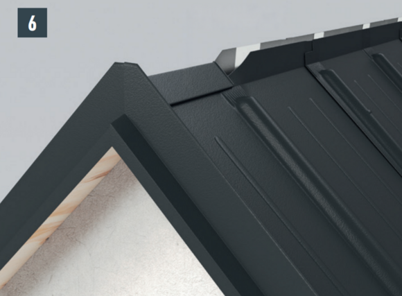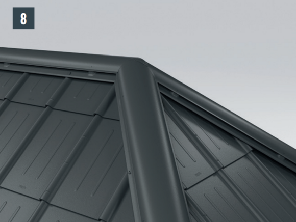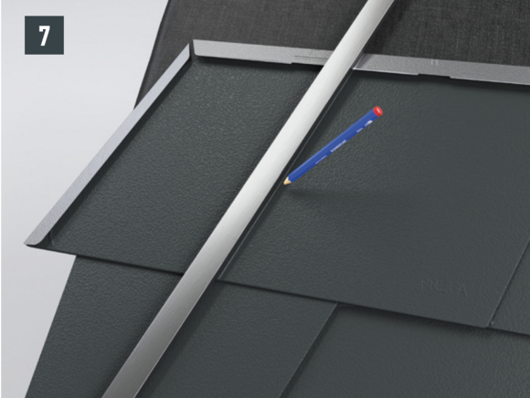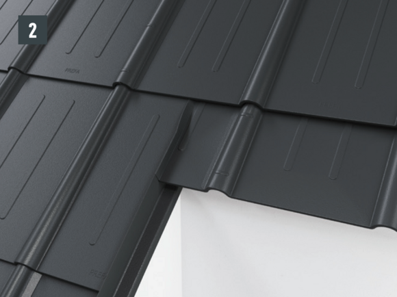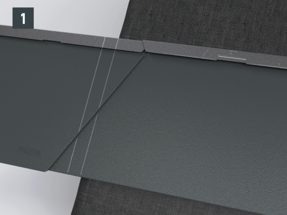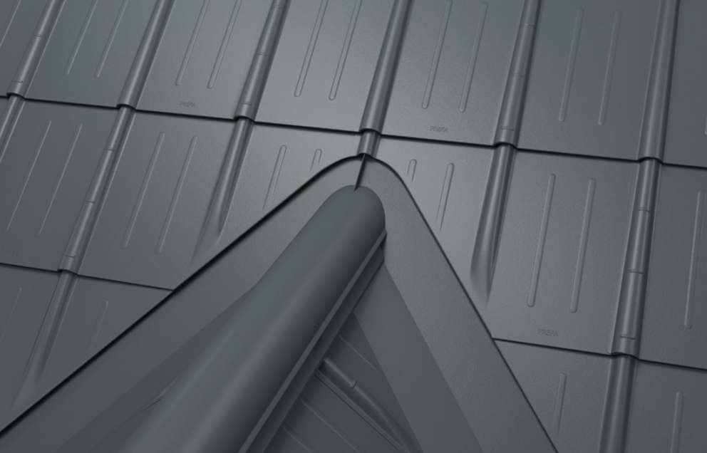 Ak je vzdialenosť medzi strešnou krytinou PREFA a bodom hrebeňa menšia ako 150 mm a nie je potrebné odvetrávanie, môžete použiť jednoduchý hrebenáč na hrebeň.