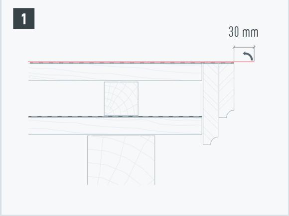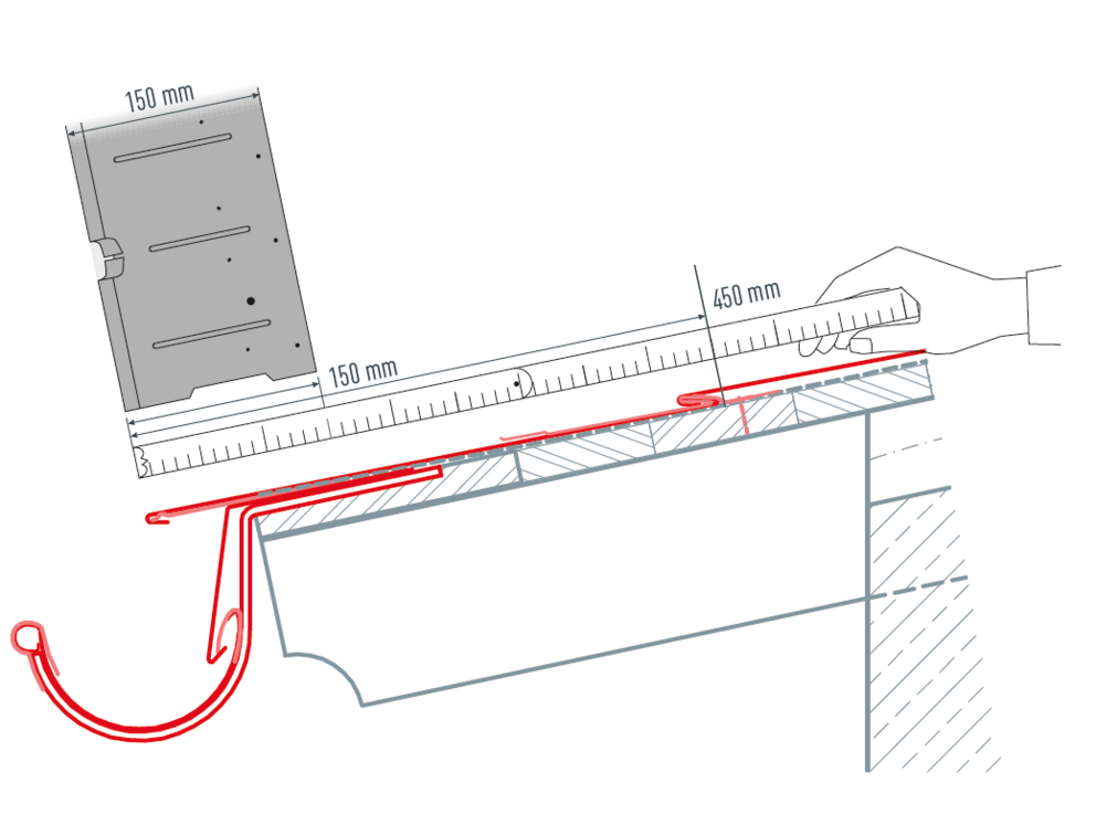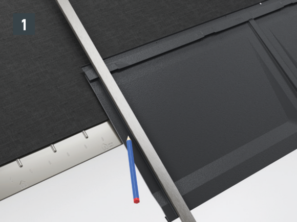 Odmerajte 450 mm od plánovaného horného okraja prvej falcovanej škridle smerom k odkvapu (dávajte pozor na to, aby bol presah odkvapu 30 až 80 mm). 150 mm (šírka podkladového pásu) od spodného okraja si urobte značku (= šírka podkladového pásu, horný okraj).