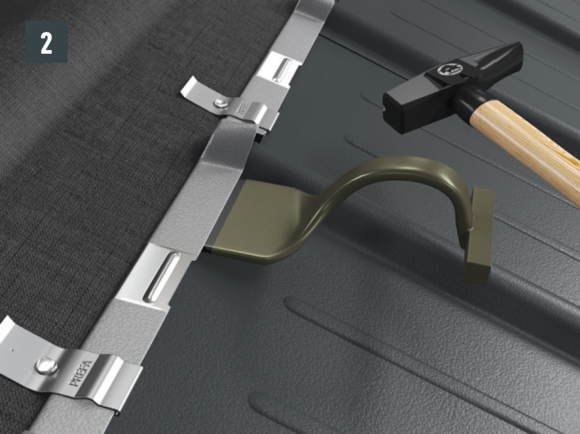 Podkladový pás musí byť pribitý tak, aby odolal búrke (priklincujte všetky vopred vyrazené otvory). Pred pribitím všetkých vopred vyrazených otvorov priloženými klincami PREFA provizórne upevnite celý podkladový pás.