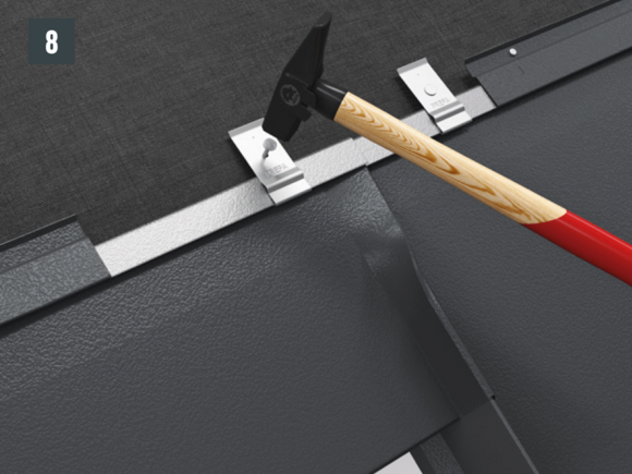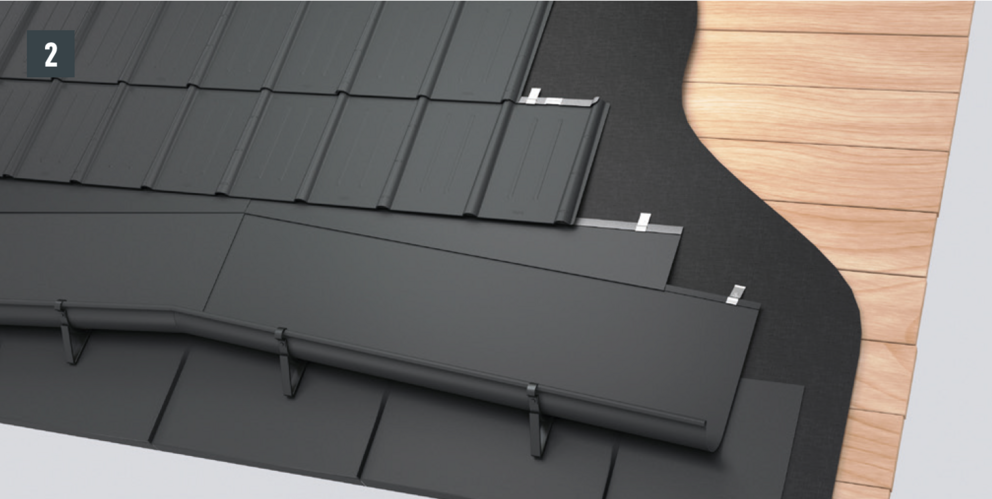 Ak má byť na falcovanej škridle namontovaný priebežný štítový plech, musí byť horný spätný ohyb škridle zarovnaný tak, aby bolo možné zavesiť rovný štítový plech.