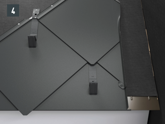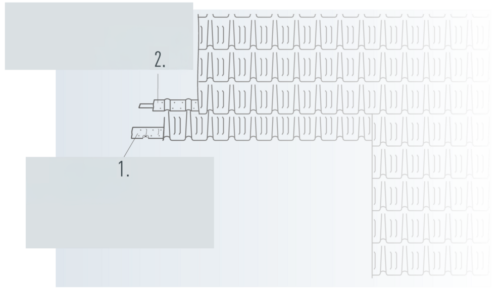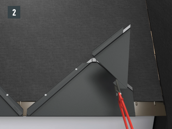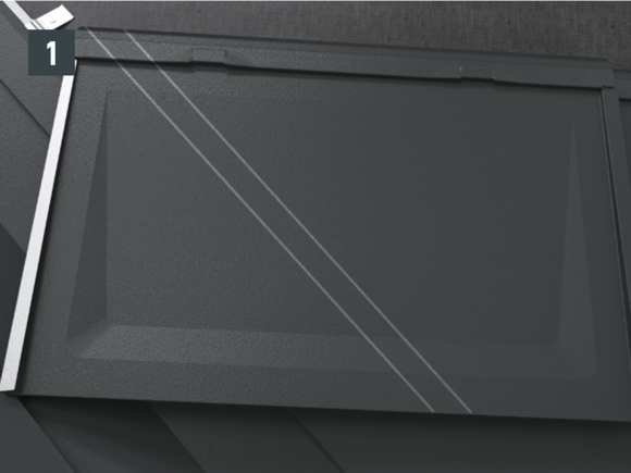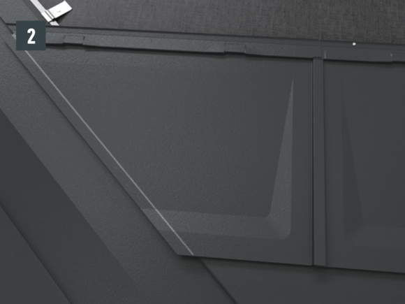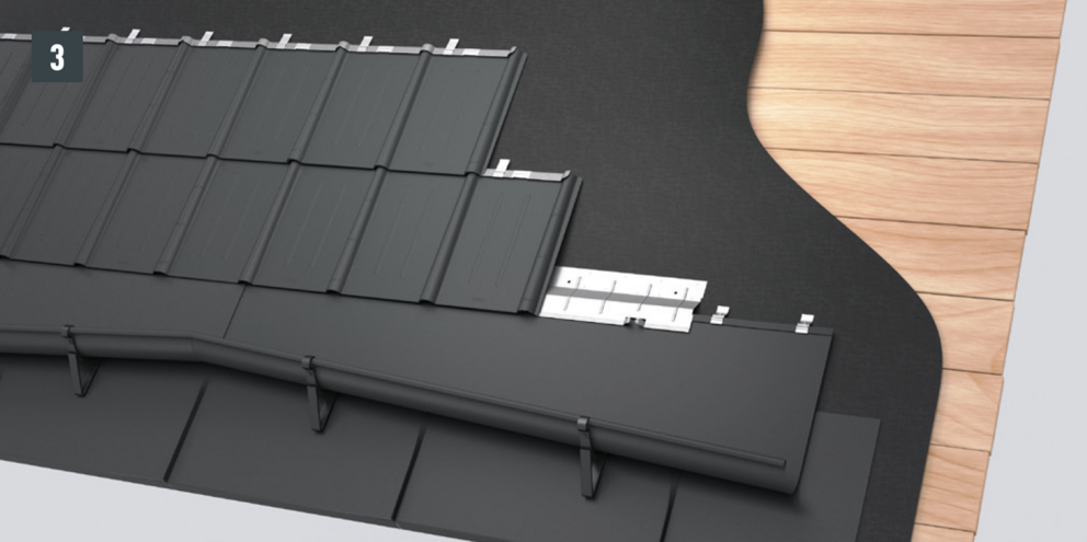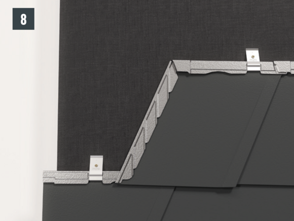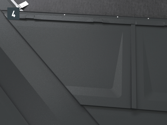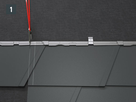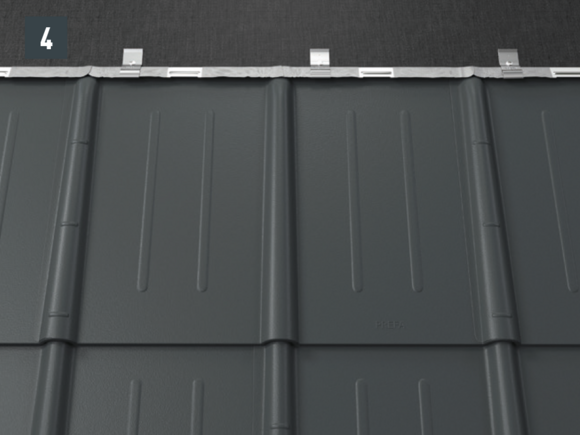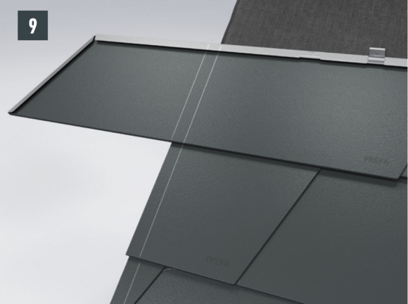 Posledný (v prípade potreby skracovaný) rad panelov upevnite pomocou spätnej príponky priamym upevnením vedľa vrcholu vlny podloženej vlny (pri PREFA falcovaných škridlách) alebo priamym upevnením nad penový klin odvetrávacieho hrebenáča Jet-Lüfter.