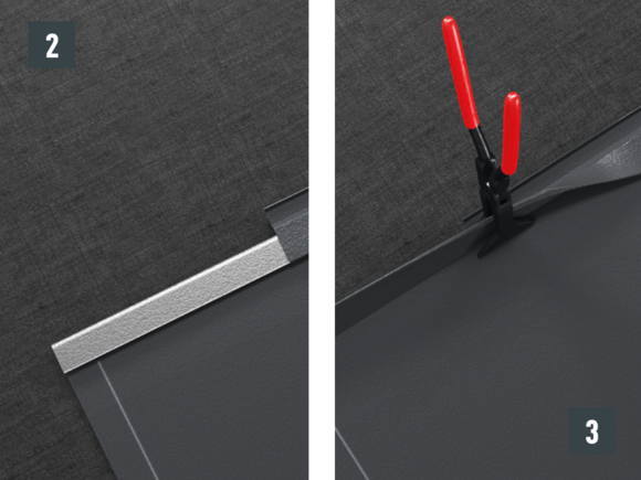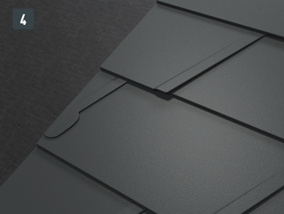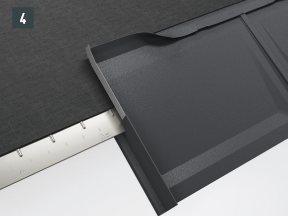Po skrátení falcovanej škridle stlačte jej strednú vlnu a potom záhyb položte, aby ste vytvorili závesnú drážku. Stlačený záhyb môžete vytvoriť pomocou falcovacích klieští alebo tiež pomocou ryhovacieho a vrúbkovacieho stroja.
