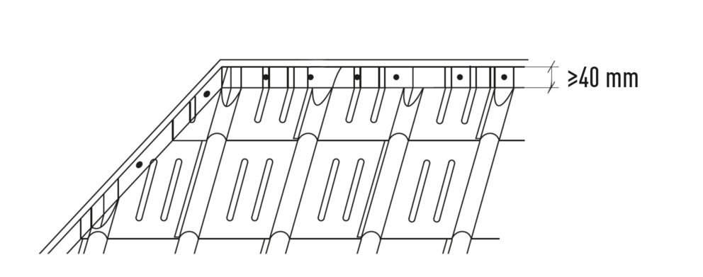 Aby bola strecha zabezpečená proti naviatemu snehu, je bezpodmienečne nutné vytiahnuť strešnú krytinu PREFA v oblasti hrebeňa a nárožia aspoň o 40 mm.