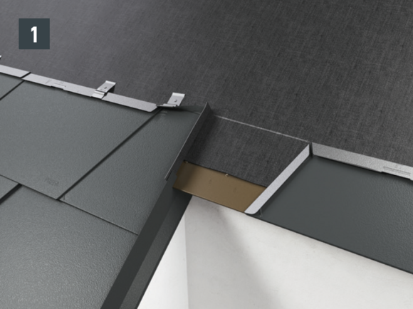 Ak na ľavej strane úžľabia vychádza styčný bod úžľabie/spoj šindľa, musíte pri strešných šindľoch DS.19 vopred namontovať pásový šindeľ DS.19 (1).