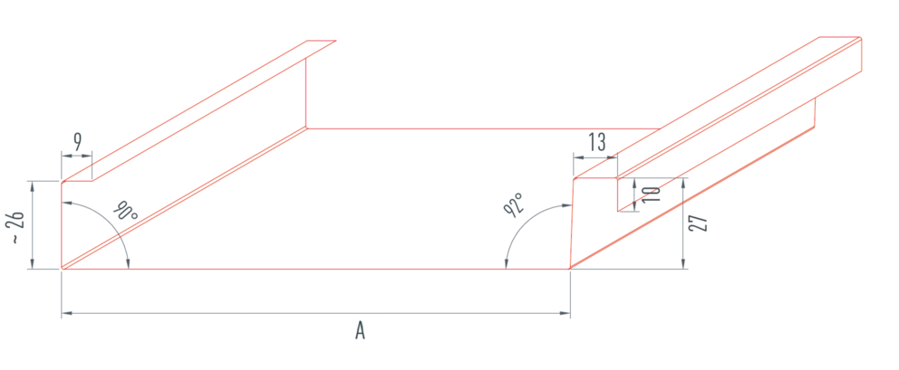 Uhly a rozmery profilu, ktoré je potrebné dodržať, sú zobrazené na obrázku nižšie a musia sa bezpodmienečne dodržať. Zmeny rozmerov profilu môžu spôsobiť vydúvanie krytinových pásov a k chybnej pokládke!
