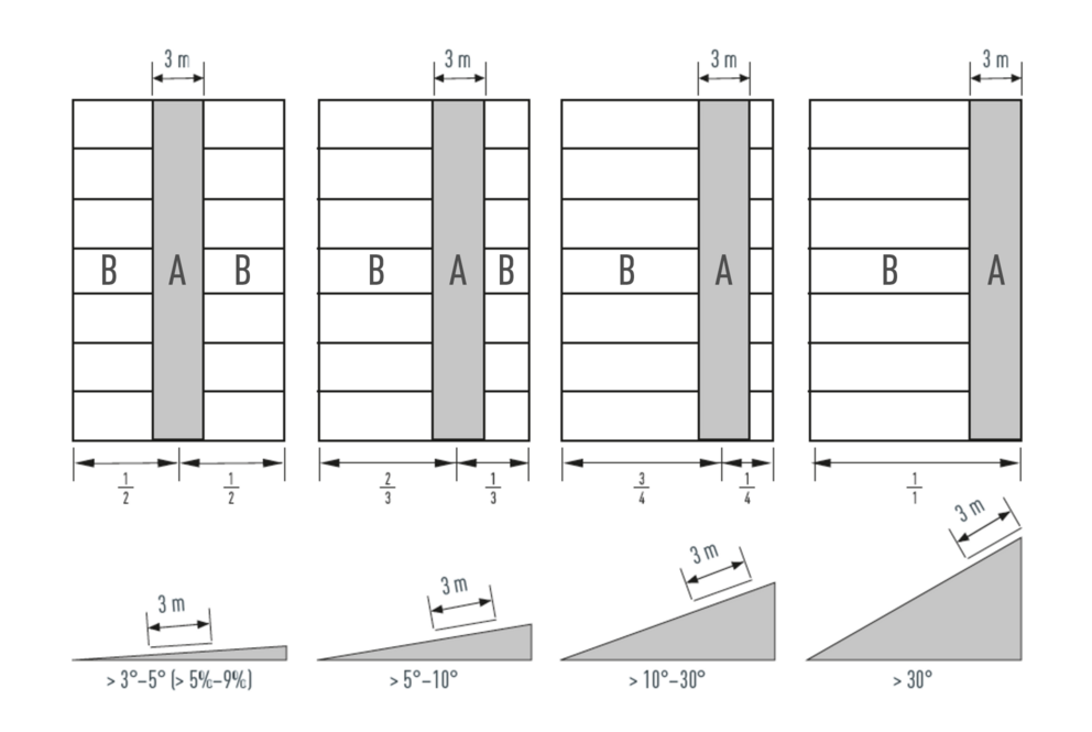 Dĺžka oblasti pevnej príponky má byť 3 metre. Pozíciu oblasti pevných príponiek treba zvoliť v závislosti od sklonu strechy – pozri obrázok nižšie a príslušnú tabuľku. Prestupy alebo tvar strechy môžu ovplyvniť pozíciu oblasti pevných príponiek. Oblasti s rozdielnou pozíciou oblasti pevných príponiek oddeľte separačnými lištami.