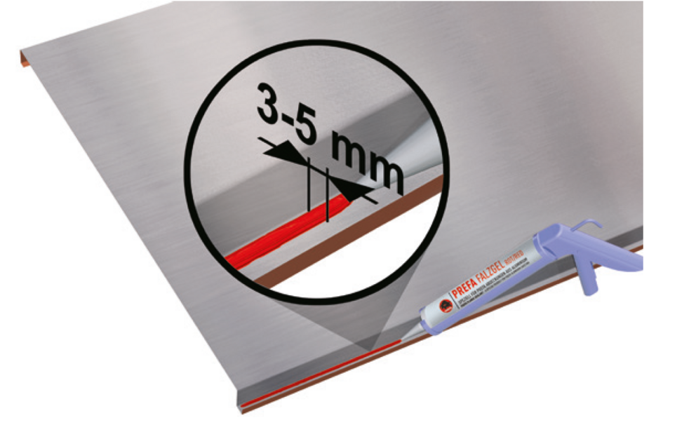Čím je sklon strechy nižší, tým vyššie je riziko, že voda vo forme prudkého dažďa, snehu, prípadne aj nahromadení vody prenikne cez drážku pod kovovú krytinu. Až do sklonu strechy 7° je potrebné prijať osobitné opatrenia na utesnenie, napr. použitie drážkového gélu PREFA.