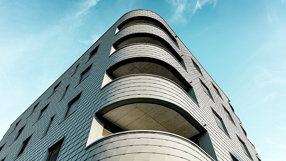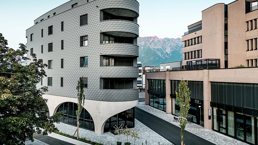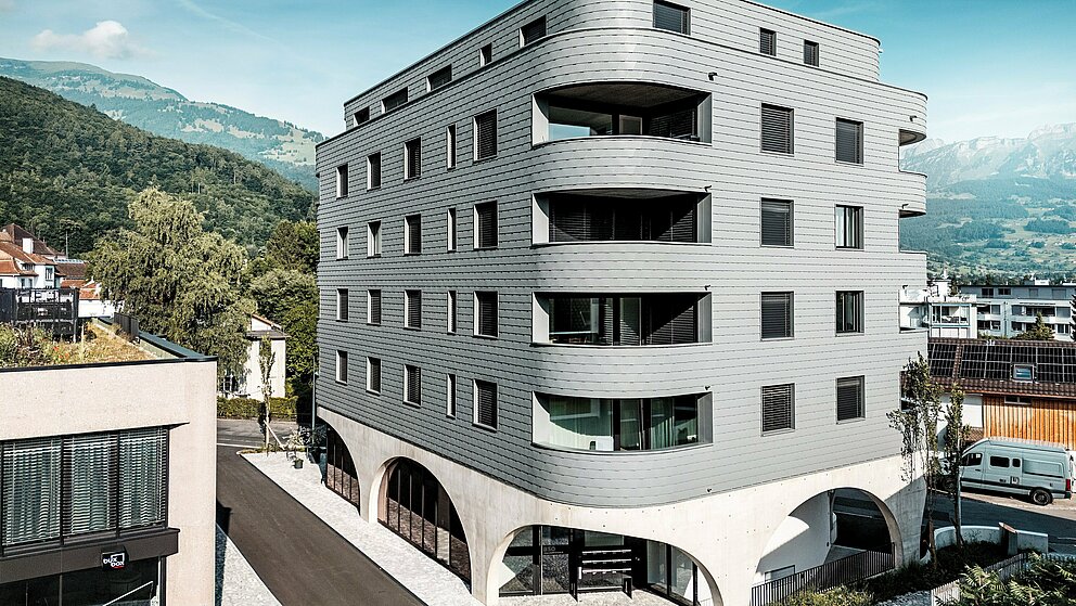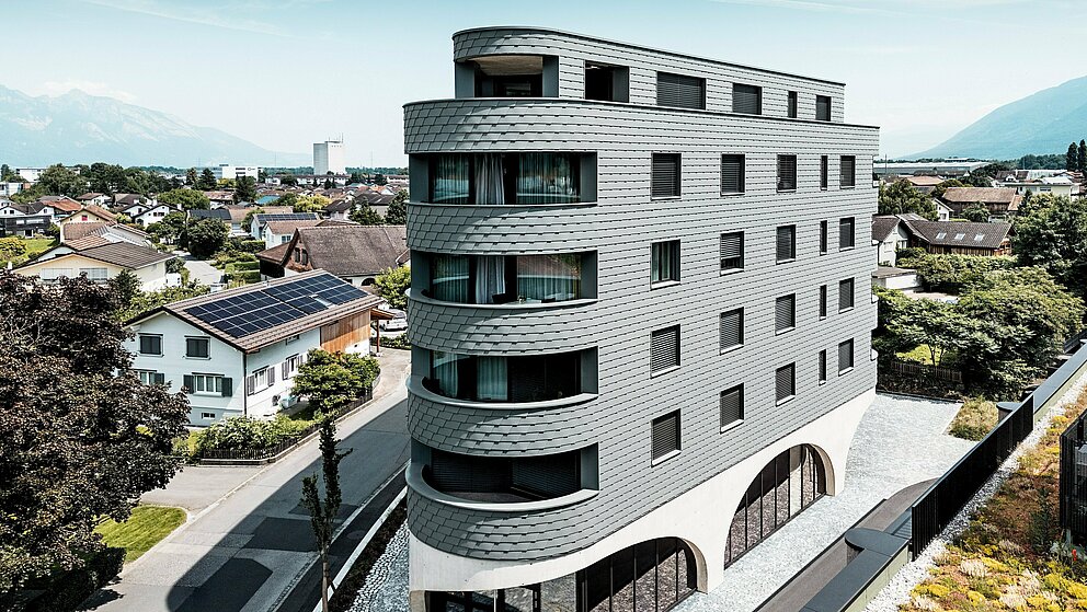 Novostavba kombinuje poctivú masívnu konštrukciu s výnimočným vzhľadom. Ten je daný jednak trojuholníkovým pôdorysom budovy bez ostrých rohov. Na druhej strane jej „šupinatá hadia koža“ z drobných fasádnych šindľov PREFA v odtieni P.10 svetlošedá, vytvára rovnomerne obiehajúcu kovovú fasádu, ktorá je skutočným lákadlom. Navyše ide o dobrú voľbu, pretože vďaka svojmu formátu je možné šindle ukladať aj v úzkom rádiuse, čo umožňuje zaoblené rohy. „Priamo za našou budovou sa začínajú tradičné švajčiarske rodinné domy – a tie sú u nás pokryté šindľami,“ vysvetľuje Keller svoje kreatívne dizajnové rozhodnutie.