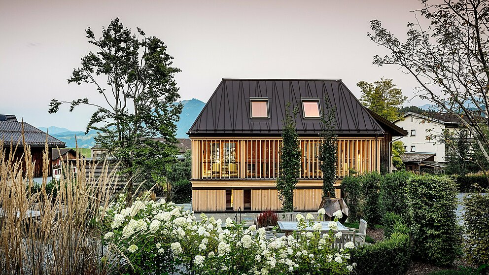 Cieľom architektiek bolo harmonicky doplniť trilógiu budov hotela. Tretia budova, „kúpeľný dom“, mala ladne korešpondovať s tradíciou, topografiou a areálom a inovatívne adaptovať charakteristické rysy domu v štýle Bregenzerwälderhaus. S vedomím, že strecha bude v historickom centre dediny dobre viditeľná, spoločnosť NONA vyvinula vlastnú víziu: „Túto strechu sme pre budovu chceli za každú cenu,“ hovorí architektka Anja Innauer o svojom koncepte PREFA strechy so sklonom 60 stupňov a atypickými stojatými falcami, ktoré čiastočne prebiehajú šikmo cez strešnú plochu. Odvážny nápad, ktorý spočiatku narazil na skepticizmus. Architektky však spolu so svojimi stavebnými vedúcimi Flatz & Jäger dokázali v otvorenom dialógu nadchnúť realizátorov, obyvateľov a remeselníkov pre svoju odvážnu reinterpretáciu tradičného formálneho jazyka.